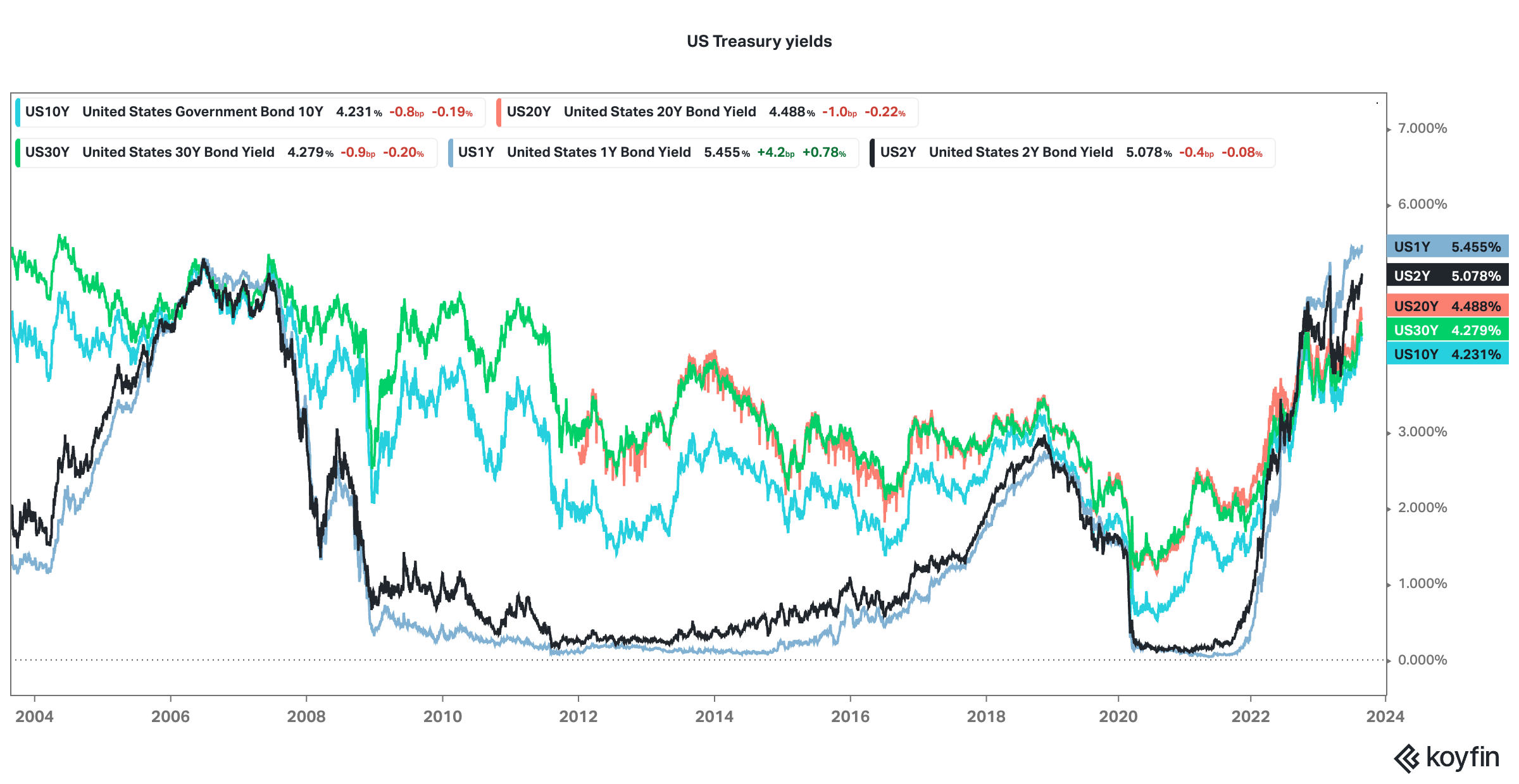 Bond Yields are rising. Fast. Why? Central banks raising rates, “higher for longer inflation” expectations and US government keeps issuing more debt to fund spending (higher supply of bonds = lower bond prices = higher yields).